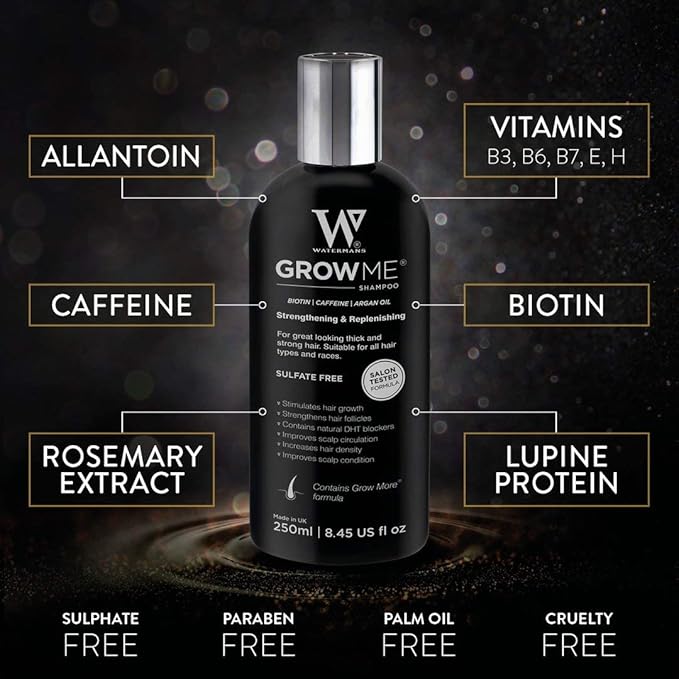 Grow Me Shampoo is an award-winning hair loss treatment designed for both men and women, particularly effective for combating male pattern baldness and hair thinning. It contains a powerful blend of natural ingredients like Rosemary Oil, Biotin, Niacinamide, and Caffeine, which nourish the scalp and promote hair growth. This shampoo targets hair loss, increases hair thickness and volume, and enhances overall hair health.